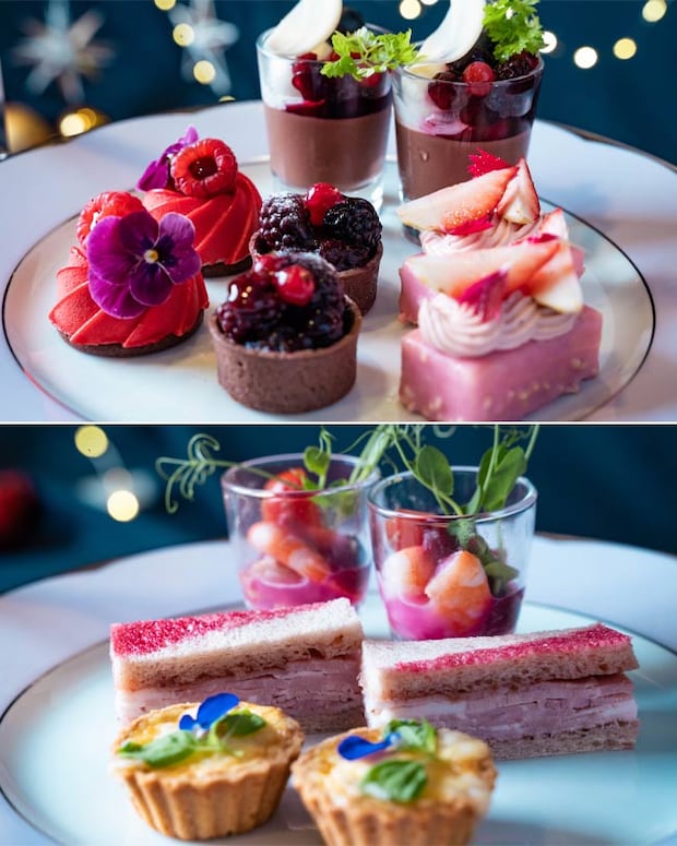 ティースタンドの最上段には、フォトジェニックな4種のスイーツが勢揃いする。甘酸っぱい「ミックスベリータルト」や、ベリーとチーズの濃厚なマリアージュを堪能できる「ストロベリーチーズケーキ」、鮮やかな赤が印象的な「フランボワーズ」、なめらかな口どけの「ベリーチョコレートパンナコッタ」がラインナップ。ジュエリーのようなスイーツは、思わずうっとりとするほどの美しさ。また、スイーツの合間にセイボリーで口直しも。