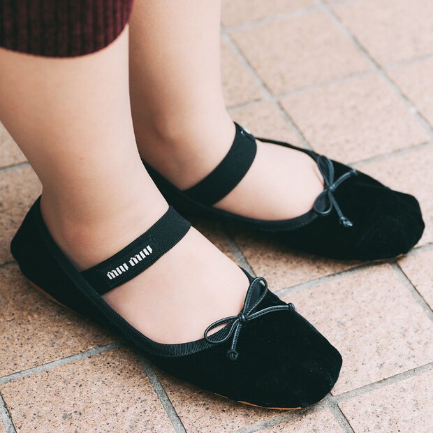 『ミュウミュウ』のメリージェーンシューズで甘さをトッピング! ベロア素材がリラクシーな装いに上品さをプラスしてくれる。
