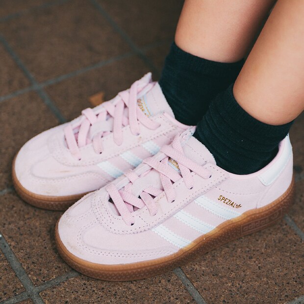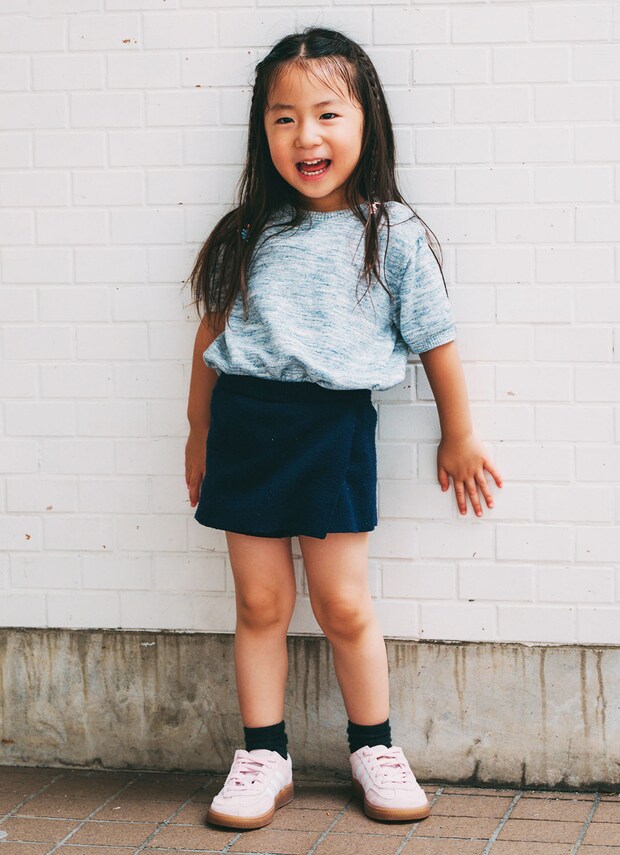 『アディダス』のペールピンクスニーカーがガムソールと相まって、優しい足元に。ブラックのソックスを合わせて、メリハリをつけたのがポイント。