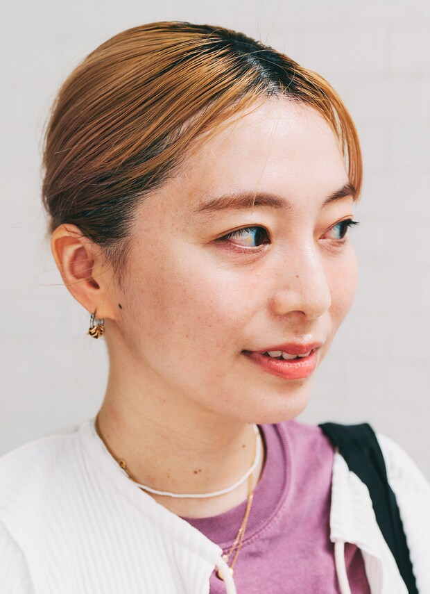 ゴールドのイヤリングとネックレスで華やかさを演出。コーラルピンクのリップを挿してヘルシーな顔周りに昇華!