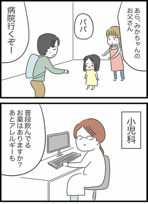 娘を保育園に迎えに行き、小児科に連れて行った夫。「普段飲んでいる薬はありますか?あとアレルギーも」と医師に聞かれ、「ちょっと聞いてみます」と妻に電話で確認しますが…。
