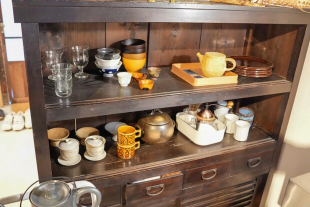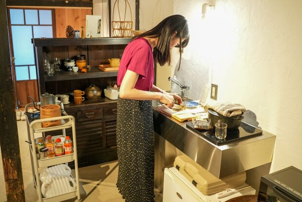 キッチンがあるので、自分で料理をすることも可能。調理器具や食器も揃っていて便利です。