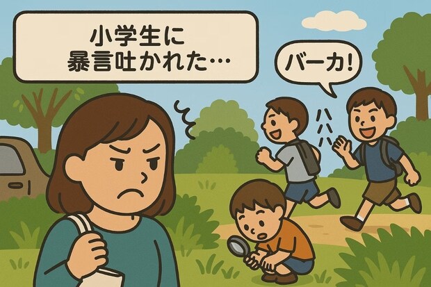 買い物から帰宅し、車の中で荷物の整理をしていると、庭に居た子どもに向かって、学校帰りの小学生2人組が暴言を吐いて笑いながら走り去る姿を見た投稿者さん。投稿者さんが車に居たことには気付いていなかったようです。