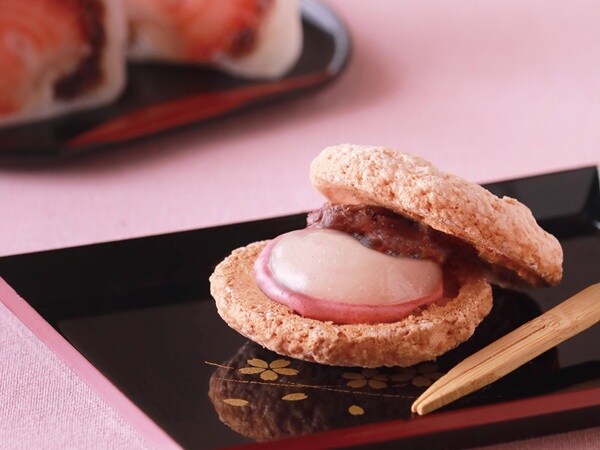 ふわっと苺が香るダックワーズ生地に、ほどよい酸味の苺チョコフィリングともちもちのおもち、小倉あんをサンド。苺の華やかな香りと小倉あんの上品な甘さが織りなす味わいで、ひと口で“苺大福”のようなハーモニーが広がる冬のスイーツだ。