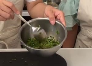 1.ニラ(真ん中の柔らかな部分)をみじん切りにして、しょうゆ、水、酢を混ぜ合わせてニラだれを作ります。残りのニラ(葉先と根本部分)とキャベツの葉部分を約4cm幅に切り、キャベツの芯部分は薄切りにします。