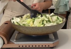 3.フライパンにごま油(分量外)をひき、約4cm幅に切ったニラ(葉先と根本部分)とキャベツの葉部分を強火で炒めます。シャキシャキとした食感を残すため、炒めすぎずに火を止めます。強火で炒めて焦げ目を少しつけるのが、香ばしさが増すポイントです。