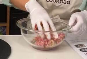 2.豚ひき肉に、オイスターソース、すりおろしニンニク、ショウガ、コショウを加えてよくこね、ひと口大に丸めておきます。