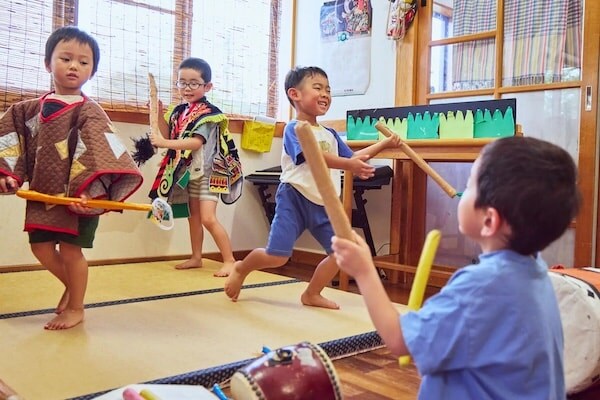 二つ目の特徴は、地域の文化が日常に息づき、「暮らしの中で文化と出会う」体験ができる点。地域に根づく文化が、こどもたちの園生活に自然と溶け込んでいる。例えば、地元の伝統芸能「石見神楽(いわみかぐら)」。こどもたちが、神楽の囃子を楽しそうに奏でる。園には、文化は特別なイベントではなく、日常の延長にあるものとして体感できる環境がある。また、地域の季節行事や収穫体験、カフェでの交流などを通して、家族全体で地域の営みに寄り添う時間を過ごせるのも魅力だ。