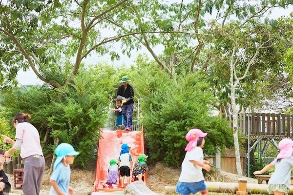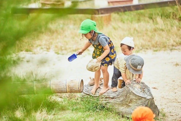 一つ目の特徴は、海と森に囲まれた「生活を遊びに変える」園庭環境だ。あさりこども園の園庭は、海沿いの浜風が抜けるロケーションと、森の緑が交差する自然豊かな立地にある。園児約40人規模の異年齢保育の中、園庭では、砂山を中心に「登る・隠れる・焚き火を囲む」といった多様な動きを引き出す遊具・空間が配置されている。こどもたちは“遊び”を通じて、挑戦・選択・身体操作・リスクコントロールといった成長の要素を日々身体で体験できるのが強み。