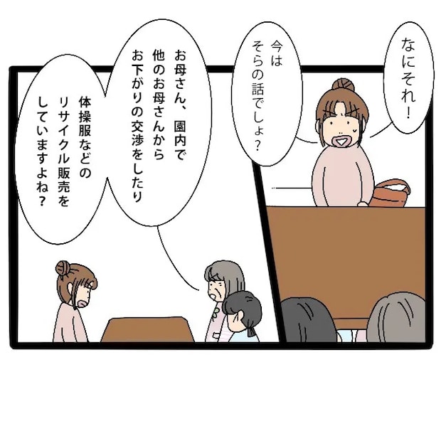 そらの話をしに来たはずなのに、園長先生が切り出したのはまさかの『私への苦情』でした。私は「なにそれ!今はそらの話でしょ?」と声を荒げますが、園長先生は表情を変えず淡々と続けます。「お母さん、園内で他のお母さんからおさがりの交渉をしたり、体操服などのリサイクル販売をしていますよね?」