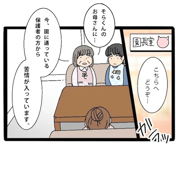私はそのまま園長室へ通されました。部屋の中には重苦しい空気が漂っています。案内されるまま席に座ると、園長先生が神妙な面持ちで「そらくんのお母さんに・・・今、園に通っている保護者の方から苦情が入っています」と言いました。