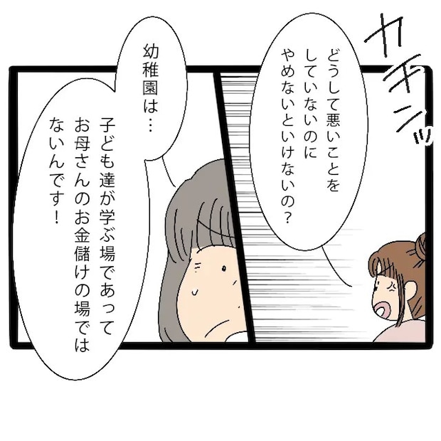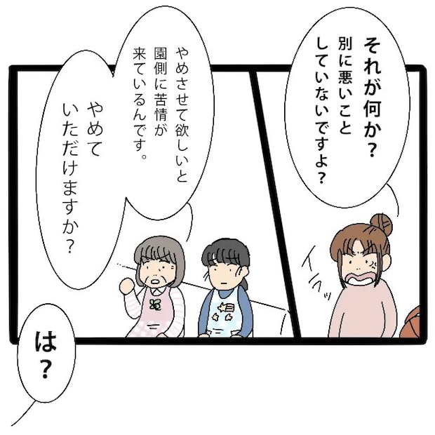 いじめとは関係ない話を持ち出す園長先生に、私は苛立ちを隠せませんでした。「それが何か?別に悪いことしていないですよ?」と強めの口調で返すと、園長先生は冷静に「やめさせて欲しいと園側に苦情が来ているんです、やめていただけますか?」と言いました。その言葉にカチンときた私は、思わず「は?」と言い返します。