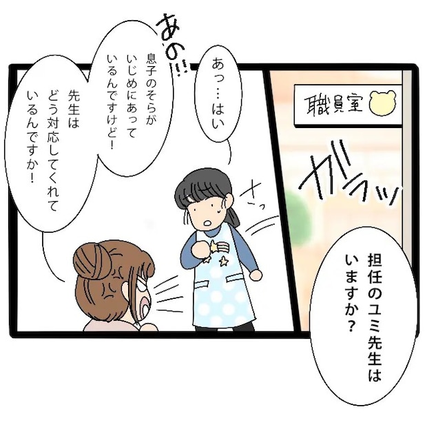 その足で職員室に向かうと、「担当のユミ先生はいますか?」と勢いよく扉を開けました。慌てて出てくるユミ先生に、「あの!息子のそらがいじめにあっているんですけど!先生はどう対応してくれているんですか!」と問いただします。