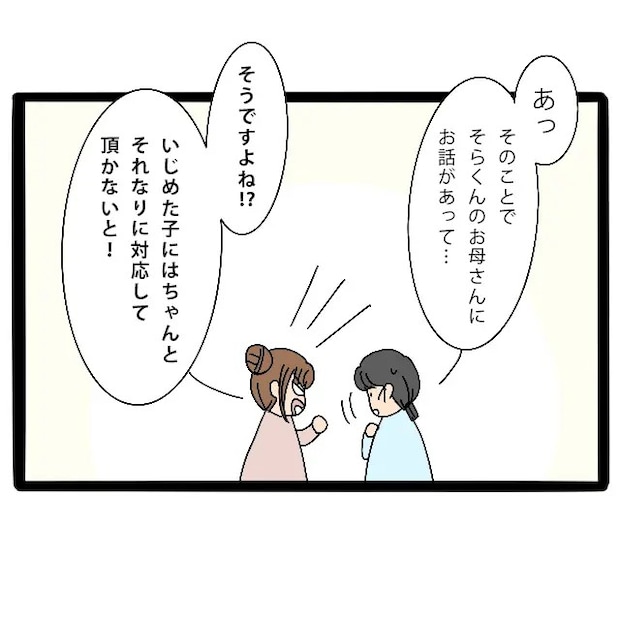 「あっ、そのことでそらくんのお母さんにお話しがあって・・・」言いづらそうに視線を落とすユミ先生。私は勢いを止めることなく「そうですよね!?いじめた子にはちゃんとそれなりに対応していただかないと!」と強く言いました。