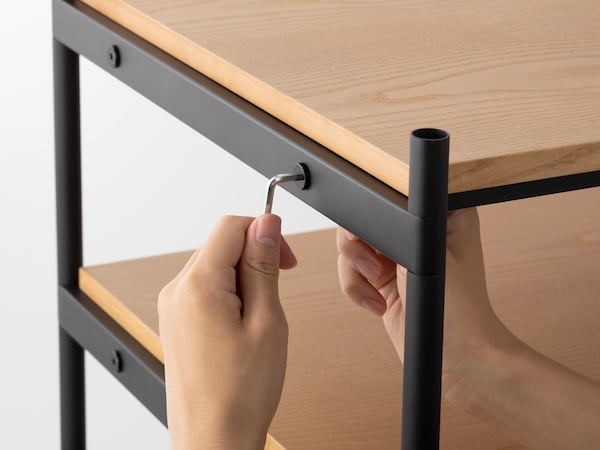 支柱は上から締め込むだけで、棚板は外側と内側からボルトで固定できる。