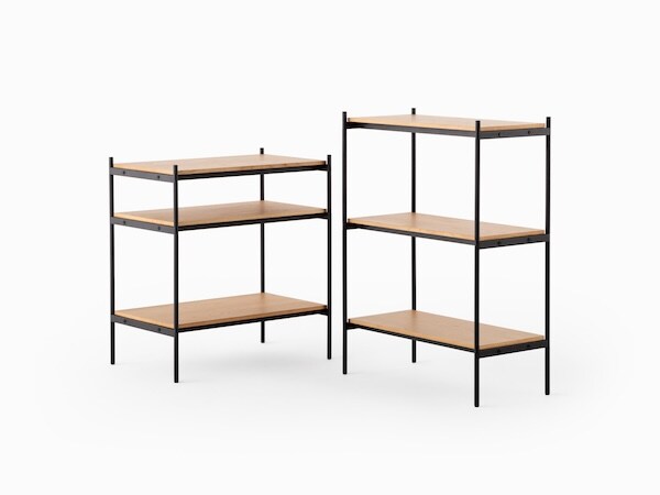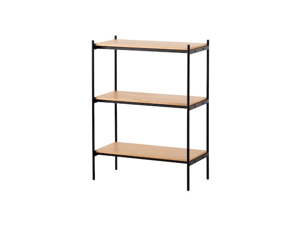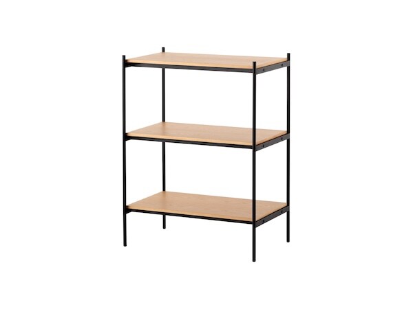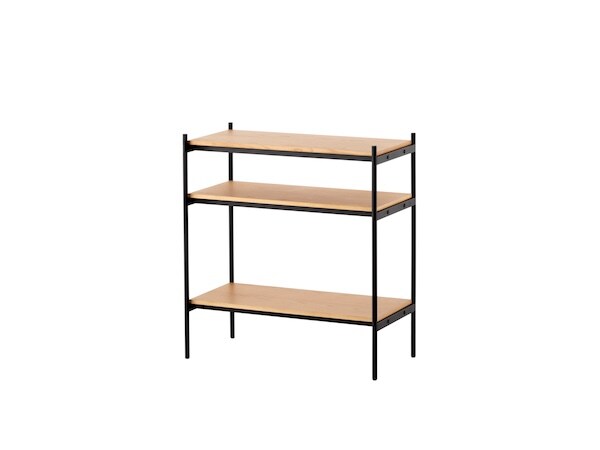 「シェルビングシステム」は全4種類のセットを用意しており、セット共通で、材質は本体が鉄(粉体塗装)、天板が天然木(ラッカー塗装)、芯材がMDF、エンドキャップがポリプロピレン、アジャスターが鉄とポリプロピレンで構成されている。全商品に転倒防止具と六角レンチが付属し、耐荷重は全体で300kg、一段あたり100kgとなっている。