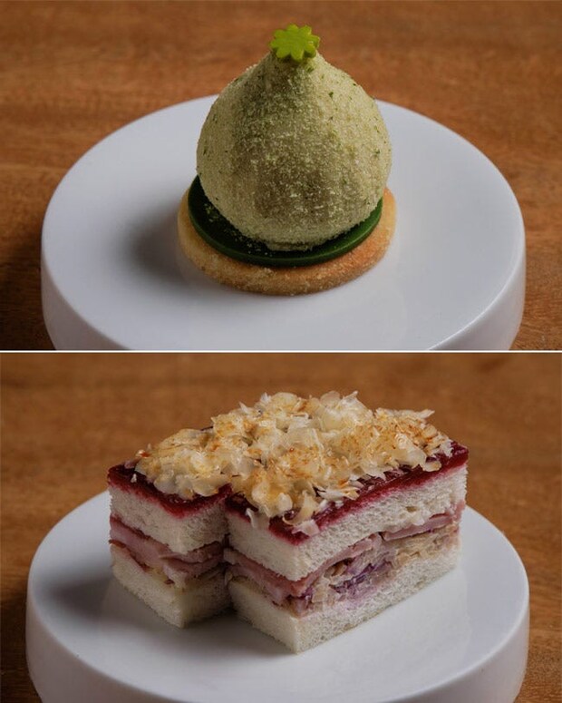 チキンとマッシュポテトのショーフロアは、クリスマスツリーに見立てて仕上げられた。しっとりと柔らかなチキンとクリーミーなマッシュポテトが織りなす味わいとともに、バターの香りがふんわり広がる。そこに香ばしいブレッドサブレのサクサクとした食感が加わり、見た目にも味わいにも楽しめる1品に。