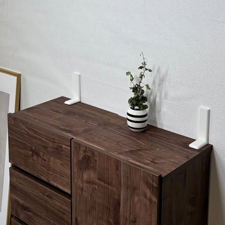 家具転倒防止補助金具「ストップ!Lくん」は、独自開発のWV金具により、9.5mm厚の石膏ボード壁でも下地を探す必要なく施工可能なので、好きな場所に家具を固定できる。