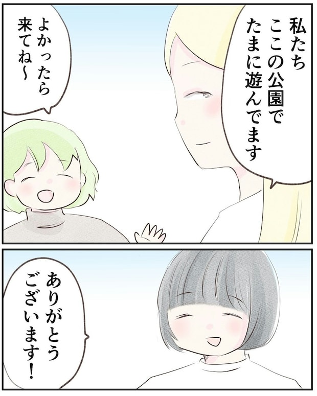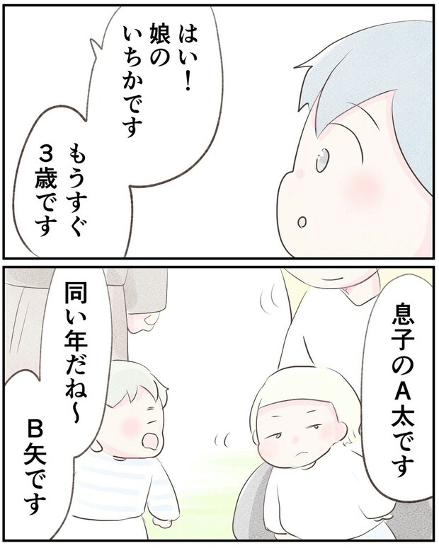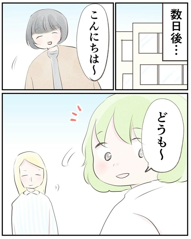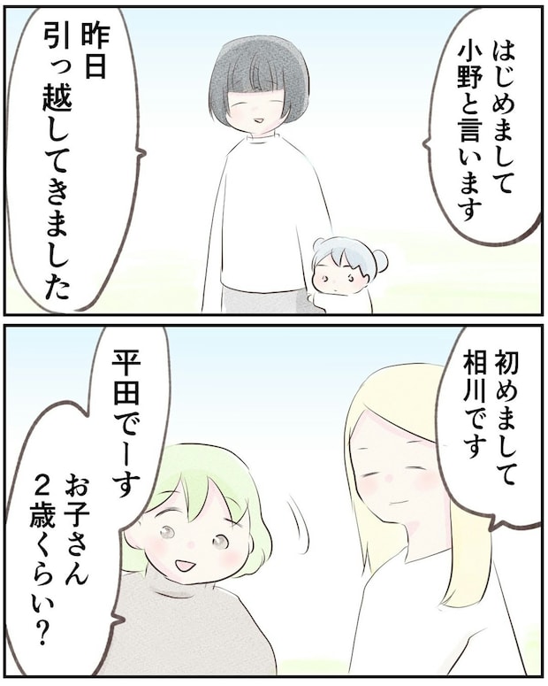 夫の転勤でこのマンションに引っ越してきた小野さんと娘のいちかちゃん。引っ越し作業も一段落したので、小野さんはいちかちゃんと散歩をすることにします。マンション内の公園に気づくと、いちかちゃんと歳の近い子どもとお母さん達を発見。まずは挨拶をしてみたのでした。