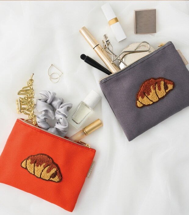 サンマルクカフェらしいオリジナルポーチ。サガラ刺繍のチョコクロを中央に配したデザインで、ふんわりとした触り心地が特徴。タグには「CHOCOCRO」の文字が書かれている。オレンジ、ブルー、グレー、レッド、グリーンの全5色展開(ランダム)。