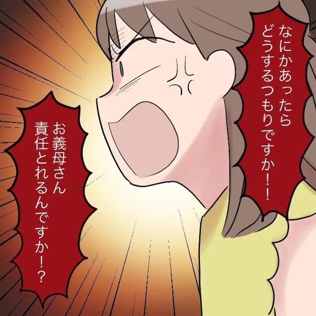「何かあったらどうするつもりですか!!お義母さん、責任とれるんですか!?」と怒りをにじませながらそう言うと、