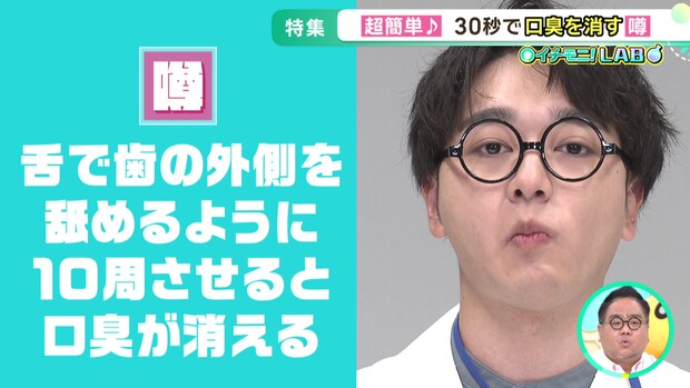 ここで、ウワサのライフハックを実践します。みちあき助手が口を閉じ、舌を使って歯の表側をぐるりと10周、約30秒間「モゴモゴ」と動かします。