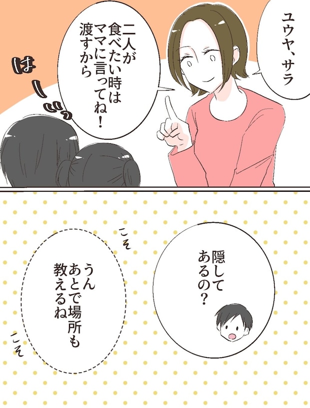 その後、「ユウヤ、サラ、二人が食べたい時はママに言ってね!渡すから」と伝えると、「はーいっ」と返事をした後、「隠してあるの?」とユウヤに言われ、「うん。あとで場所も教えるね」とこそこそ話で伝えました。