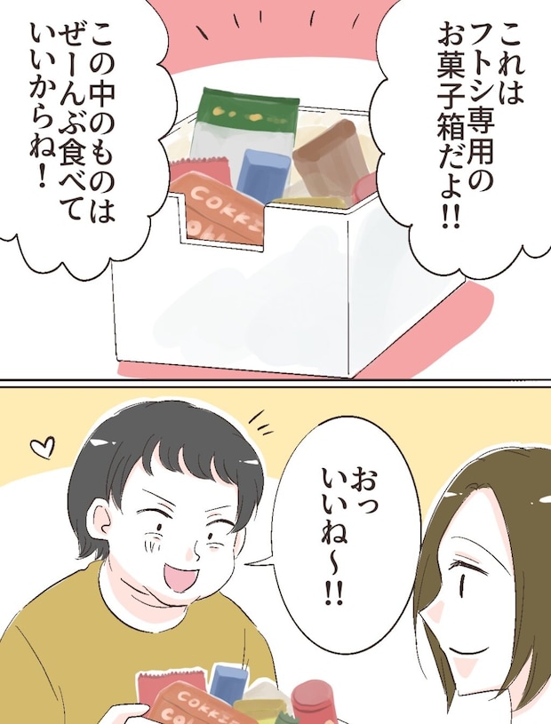 「これはフトシ専用のお菓子箱だよ!!この中のものはぜーんぶ食べていいからね!」と言うと、「おっ、いいね~!!」と嬉しそうなフトシ。