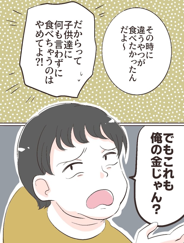 「その時に違うやつが食べたかったんだよ~」と言い出し、「だからって、子ども達に何も言わずに食べちゃうのはやめてよ!?」私の言葉に、「でもこれも俺の金じゃん?」と開き直るのでした。