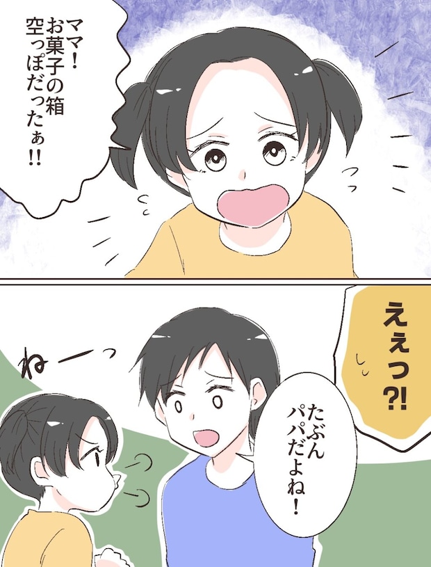 「ママ!お菓子の箱、空っぽだったぁ!!」と訴えるサラちゃん。「えぇっ!?」と驚く、お、「たぶんパパだよね!」とユウヤが言い、サラも「ねーっ」と確実にフトシが犯人だと気づいたようでした。