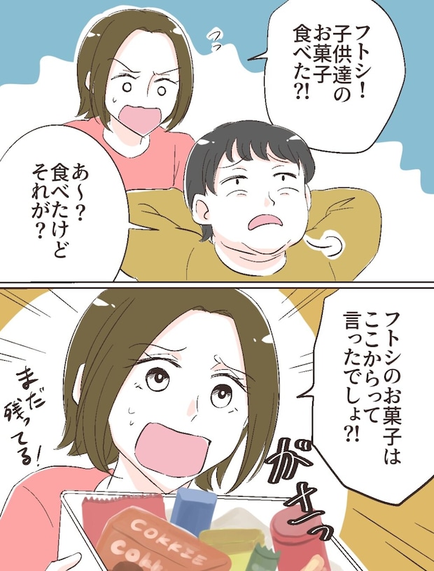 そして、「フトシ!子ども達のお菓子食べた!?」フトシに聞くと、「あ~?食べたけどそれが?」と開き直るフトシに、「フトシのお菓子ここからって言ったでしょ!?まだ残ってる!」と言い返すと、