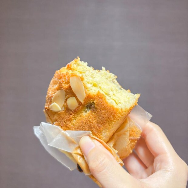 バナナケーキはしっとり生地。ひと口食べるとバナナの甘さが広がります。アーモンドのトッピングも香ばしく、コーヒーとの相性も◎