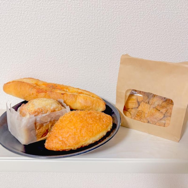 右から時計回りに、メープルラスク 1g3円・カレーパン 270円・バナナケーキ 250円・明太フランス(大)350円