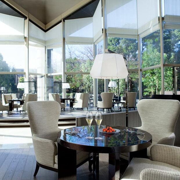 東京マリオットホテルのロビーに広がる「Lounge&Dining G」。吹き抜け+ガラス張りの爽快なロケーションで、自慢のグリル料理を。スパークリングほかバーテンダーが作る本格派のカクテルもお楽しみに。