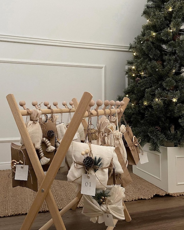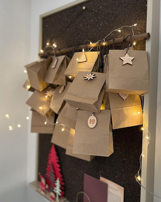 用意したアドベントカレンダーの袋をぶら下げれば、可愛いアドベントカレンダーの完成!