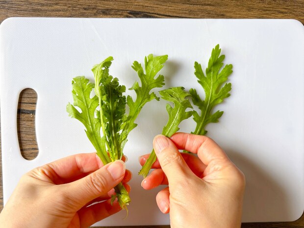 葉は手でちぎって食べやすい長さにします。茎は手で折ったり包丁でカットしたりしましょう。春菊は刃物を使うとアクがでやすいため、なるべく手でちぎるのがおすすめです。