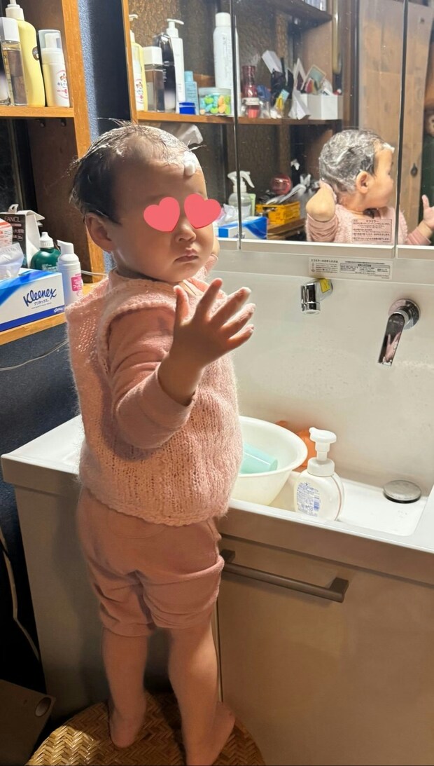 なんとハンドソープで上手に髪の毛を洗っていたわが子。これには、驚きですよね。ハンドソープで突然髪の毛を洗うなんて、誰も想像できないでしょう。