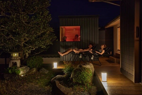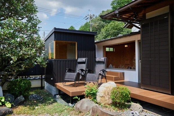 庭園内に設けられた、和サウナにも注目。黒を基調とした外観に、落ち着いた色合いの畳を敷き詰めたIZAオリジナルの和サウナとなっている。シックでスタイリッシュな空間が、心身を静かに包み込み、深いリラクゼーションへと誘う。和の趣を感じながら心身ともに「ととのう」特別な時間を過ごしてみて。