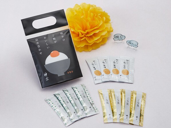 「神宗」は、天明元年(1781)に海産物問屋として創業以来、品質と味覚の向上一筋に精進を重ね、水産加工品等をつくり続けてきた。「神宗」が手がける「卵かけご飯がおいしい詰め合わせ」は、お土産やプチギフトとして人気の商品だ。