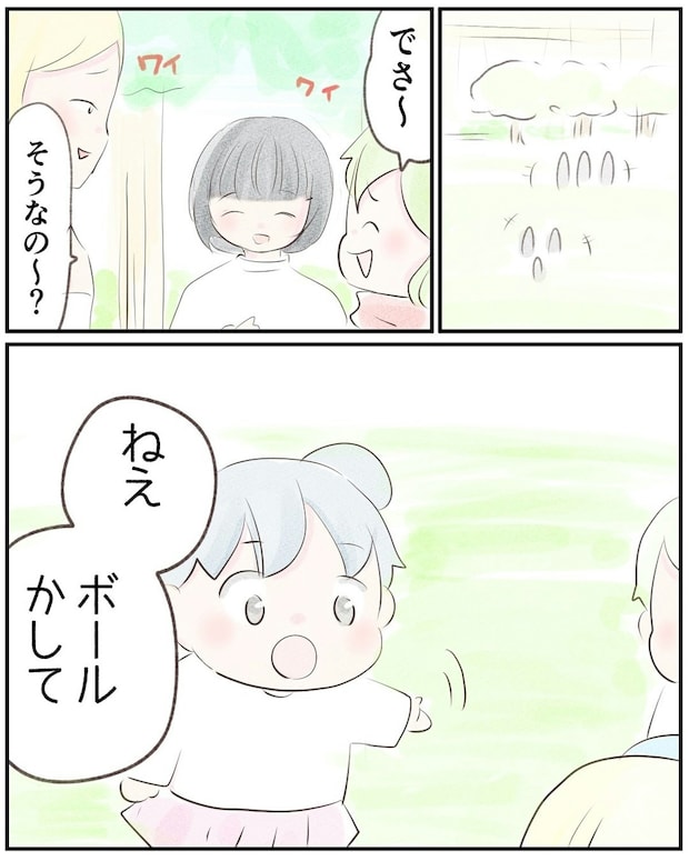 思い切って、一緒にいるお母さんたちに声をかけたことで、知り合えたのが相川さんと平田さん。2人の子どもはいちかちゃんと同い年で、小野さんは2人に一気に親近感を抱きます。