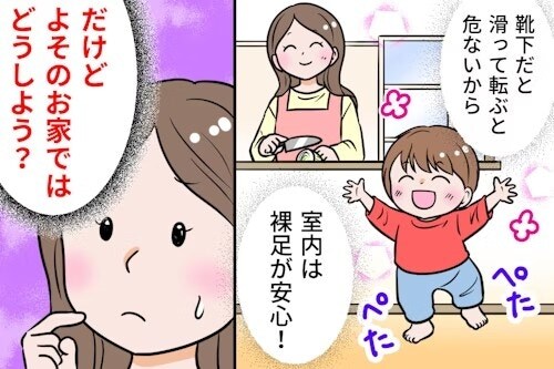 子どもとはいえ家族以外の人が裸足で室内を歩くことに抵抗がある人もいますよね。我が子の裸足は気にならないけれど、よその子どもの裸足はちょっと気になるというのも理解はできます。潔癖なわけではなくとも、同じように考える方もいるのではないでしょうか。