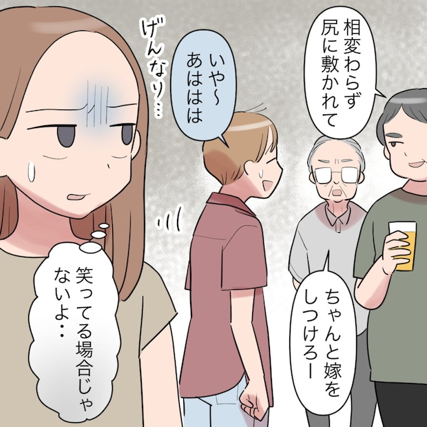 すると、「相変わらず尻に敷かれて」と半笑いで呆れたように言うかと思えば、「ちゃんと嫁をしつけろ!」とまた別の親戚が。そんな言葉にミノルは「いや~あははは」と笑っているだけ。「笑ってる場合じゃないよ・・と呆れてミノルを見つめました。