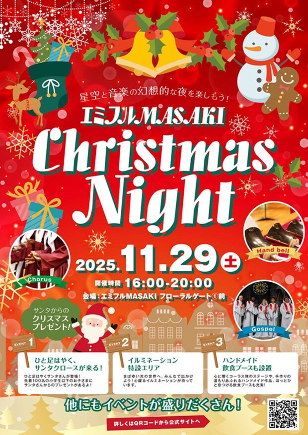 11月29日(土)には「エミフルMASAKI★Christmas Night★」が開催され、16:00~20:00の間はフローラルゲート①前広場でサンタクロースから先着100名の小学生以下にプレゼントが配布されるなど、心温まる特別企画も盛り込まれています。