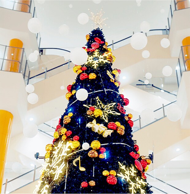 エミモール1F オレンジコートでは、毎年恒例の高さ8mのBIGツリーが今年も登場。