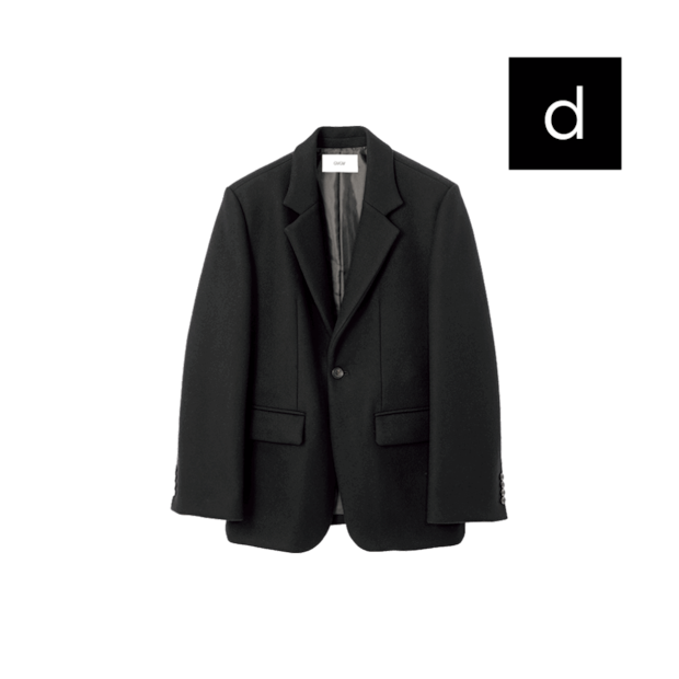 厚手で真冬も出番がありそうな黒ジャケット。王道のビッグシルエットで、どんなコーデにもしっくりハマります。¥72,600(ジーヴィージーヴィー/grapevine by k3)
