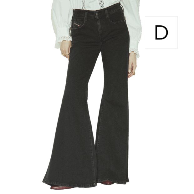 とんでもなくフレアなデザインが周囲の目を引く1本。メリハリのあるシルエットで、美脚効果も絶大です。ブラックは少しモードな印象もあり、意外とスタイリングしやすい! ¥46,200(ディーゼル/ディーゼル ジャパン)