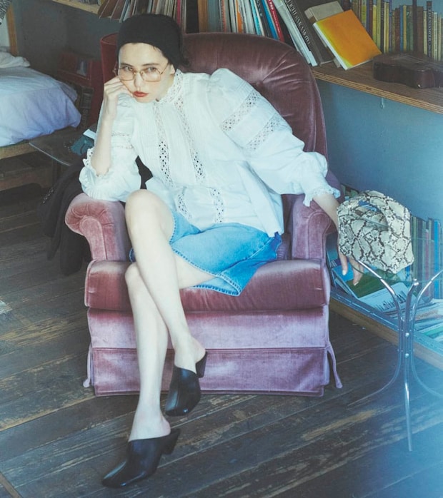 ピュアな白ブラウスとボーイッシュなハーフデニムの、大人にとっては少々チャレンジングな組み合わせ。デザイン性のあるメガネ&ミュールなど、カッチリしたアイテムをプラスするのが、子どもっぽくならない秘訣です。