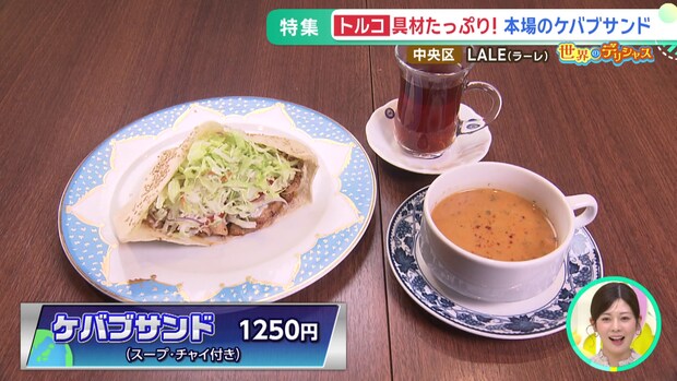 ここでは、トルコの伝統料理である「ケバブサンド」(スープ・チャイ付き 1250円)がおすすめ。