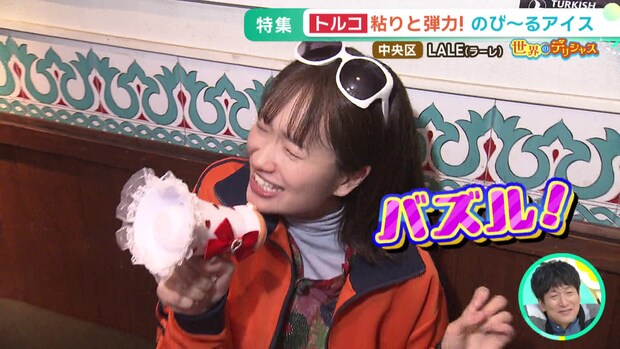 店主のムスタファさんがユーモラスにパフォーマンスを披露した後、モエーリさんがスプーンを口に運ぶと、口の中で伸びるアイスの食感と、クランベリーの果肉の食感が合わさり、再び「デリシャス!」のサイン。