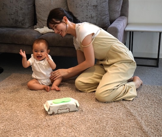 手も汚れにくいストレスフリーなおむつ替えを「colulu ふんわり極厚おしり拭き」がサポートする。